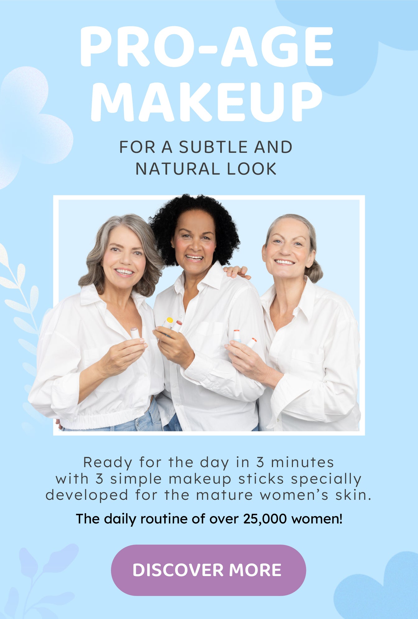 Our mission is to give 45+ women more self-confidence by making you shine naturally within 3 minutes. We do this with multifunctional make-up products that are made on a cream base.