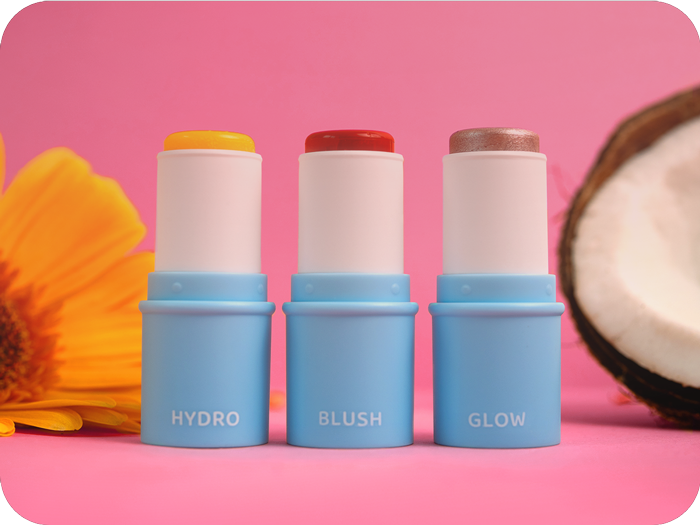 Hydro Stift ger din hud en omedelbar fuktboost och en hälsosam lyster. Blush Stift anpassar sig automatiskt efter din hudton för en fräsch, naturlig rodnad. Och med Highlighter kan du låta ljuset falla precis på rätt ställen för en mjuk glow.