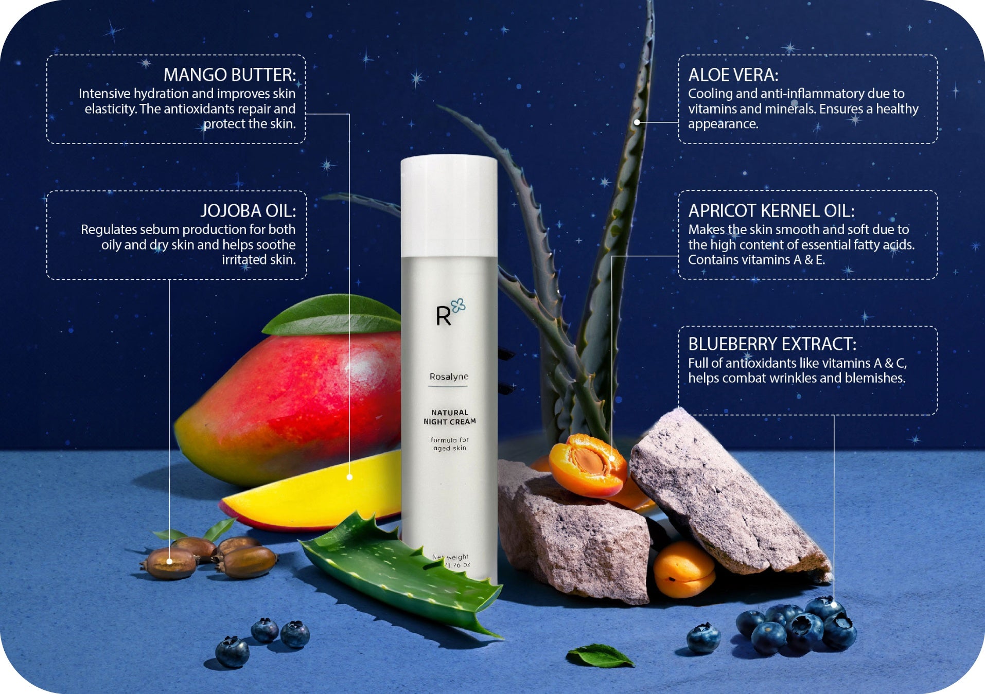 See below for the effects of the most commonly used ingredients in our night cream.